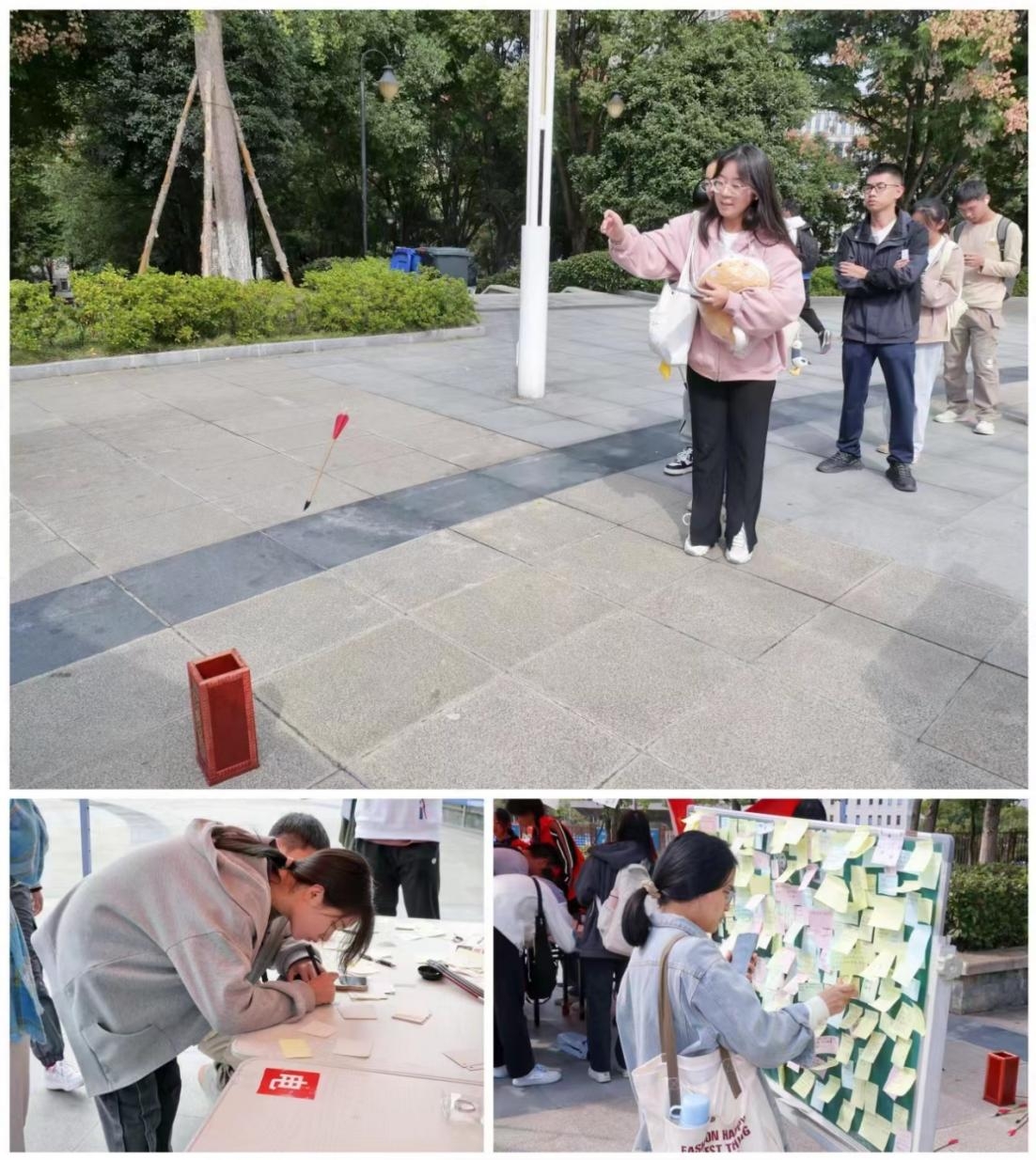 此次活动包含“翰墨华章,书画重阳”、“手写心愿,贴出祝福”、“幸运投壶,接财纳福”三个环节,在“翰墨华章,书画重阳”环节同学们用毛笔写出有关重阳的诗词或者以绘画菊花纪念重阳节的到来;在“手写心愿,贴出祝福”环节同学们拿起便利贴写下对家中老人祝福的话语,并粘贴在展板上为家中老人祈福。久久又重阳,秋风万里长,“投壶”“饮酒”“登山”每一项习俗的背后都是一个个令人动容的故事,都寄托着亘古不变的情谊和真挚美好的祝福。