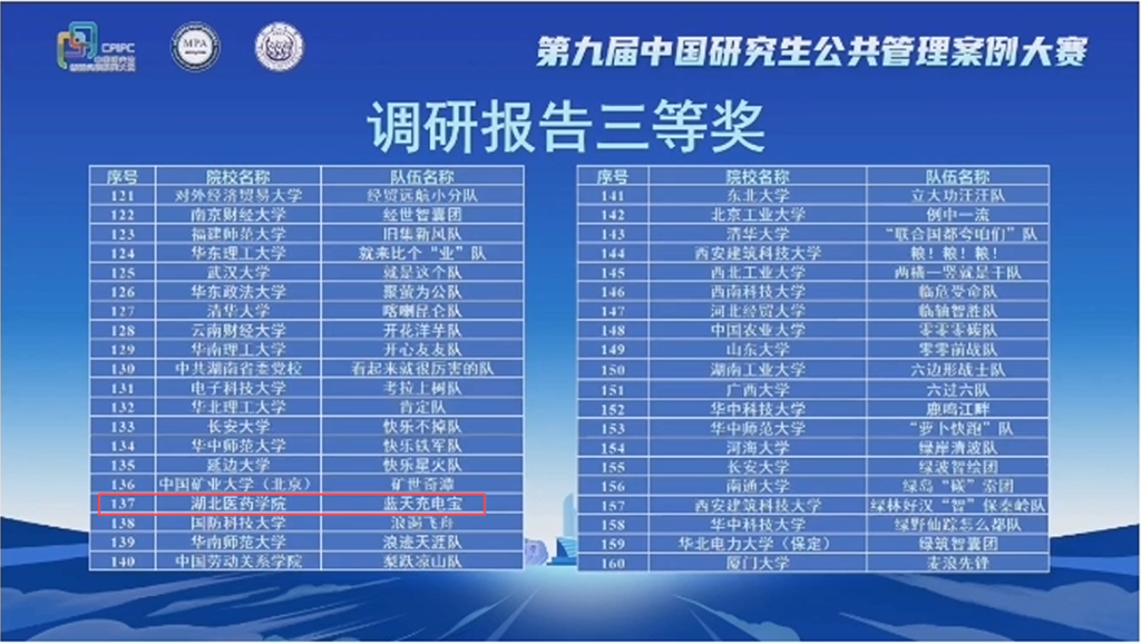 本网讯(通讯员 薛硕)2025年4月20日,第九届中国研究生公共管理案例大赛决赛在同济大学圆满落幕。在来自全国268所院校的3115支队伍的激烈竞争中,2138cn太阳集团林宏伟教授指导的“蓝天充电宝”参赛队经过层层选拔,荣获调研报告三等奖的佳绩。该案例成功跻身全国参赛案例排名前20%,取得“中国专业学位案例中心”入库资格,这也是我校管理学科案例首次入选中国专业学位案例库,是我校MPA培养成效的重要体现。